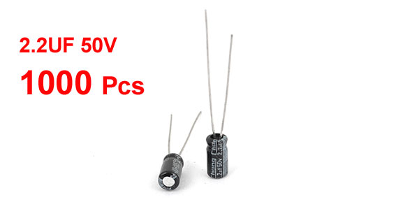 Product Name Electrolytic Capacitor Type Radial Lead Maximum Temperature 105°C Withstand Voltage 50V Capacitance 2.2UF Body Size 4x 7mm / 0.16'' x 0.28'' (D*L) Lead Length 20mm/ 0.8'' 25mm/ 1'' Total Length 33mm/ 1.2" Dielectric Material Aluminum Weight 220g Color Black, Gray Package Content 1000Pcs(± 2%) x Electrolytic Capacitors - Reviews