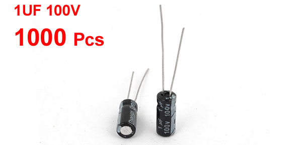 Product Name Electrolytic Capacitor Type Radial Lead Maximum Temperature 105°C Withstand Voltage 100V Capacitance 1UF Body Size 5 x 11mm / 0.2'' x 0.4'' (D*L) Lead Length 18mm/ 0.7'' 24mm/ 0.9'' Total Length 36mm/ 1.4" Dielectric Material Aluminum Weight 374g Color Black, Gray Package Content 1000Pcs(± 2%) x Electrolytic Capacitors - Reviews