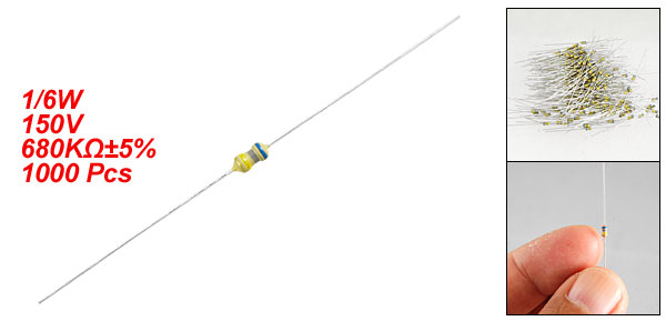Product Name Carbon Film Resistor Quantity 1000±2% Pcs Withstand Voltage 150V Rated Power 1/6W Resistance Value 680K Ohm Tolerance ±5% Lead Diameter(Approx.) 0.4mm/ 0.016" Body Size 4 x 2mm/ 0.16" x 0.08" (L*D)