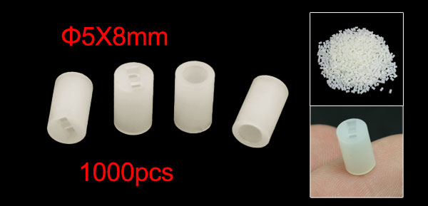 Product Name LED Spacers Quantity 1000±2% Inner Hole Dia.(Approx.) 3mm Hole Pitch(Approx.) 2mm Total Size(Approx.) 5 x 8mm/ 0.2" x 0.31" (D*L) Material Nylon Color White Net Weight 107g Package Content 1000 x LED Spacers - Reviews