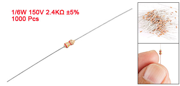 Product Name Carbon Film Resistors Rating Power 1/6W Resistance 2.4K Ohm Resistance Tolerance ± 5% Withstand Voltage 150V Size(Not Include Leads) 0.34 x 0.17cm / 0.134" x 0.067"(L*D) Leads Dia(Approx) 0.03cm / 0.012" Overall Length(Approx) 4.55cm / 1.8" Color See the Picture Weight 58g Package Content 1000(±2%) Pcs of Carbon Film Resistors - Reviews