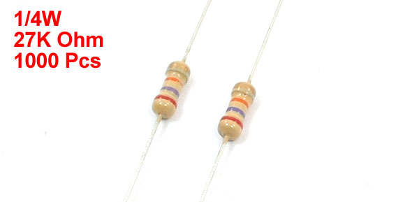 Product Name Carbon Film Resistors Material Carbon Film Power Rating 1/4W Resistance Tolerance ± 5% Resistance 27K Ohm Size (Approx.) 48 x 3mm / 1.9" x 0.12" (L*Max.D) Main Color Silver Tone, Yellowish Brown Weight 102g Package Content 1000Pcs(±2%) x Carbon Film Resistor - Reviews