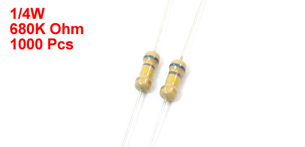 Product Name Carbon Film Resistors Material Carbon Film Power Rating 1/4W Resistance Tolerance ± 5% Resistance 680K Ohm Size (Approx.) 48 x 3mm / 1.9" x 0.12" (L*Max.D) Main Color Silver Tone, Yellowish Brown Weight 103g Package Content 1000Pcs(±2%) x Carbon Film Resistor - Reviews