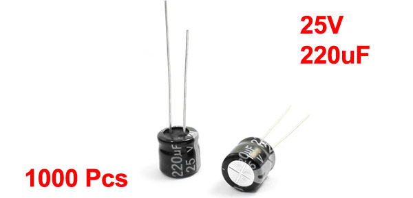 Product Name Electrolytic Capacitor Type Radial Temperature Range 105°C Voltage 25V Capacitance 220uF(±20%) Body Size 8mm x 7mm/ 0.31" x 0.28"(H*D) Lead Pitch 3mm Lead Length 25mm, 20mm Main Color Black Total Weight 629g Package Content 1000Pcs(±2%) x Electrolytic Capacitors - Reviews