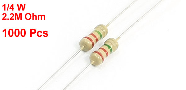 Product Name Carbon Film Resistors Material Type Carbon Film Rated Power 1/4 W Resistance Value 2.2M Ohm Tolerance ±5% Total Size(Approx.) 46 x 2mm/ 1.8" x 0.08"(L*Max.D) Color As Picture Shown Weight 94g Package Content 1000 (± 2%) x Carbon Film Resistors - Reviews
