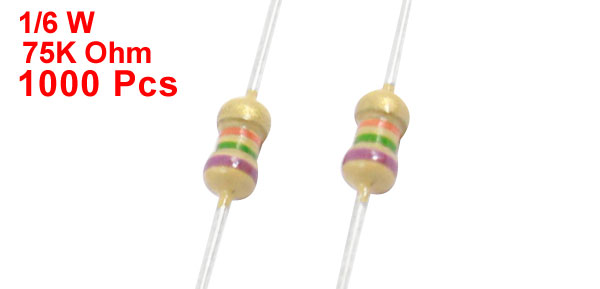 Product Name Carbon Film Resistors Material Type Carbon Film Rated Power 1/6 W Resistance Value 75K Ohm Tolerance ±5% Total Size(Approx.) 46 x 2mm/ 1.8" x 0.08"(L*Max.D) Color As Picture Shown Weight 55g Package Content 1000 (± 2%) x Carbon Film Resistors - Reviews