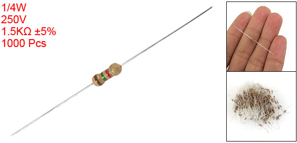 Product Name Carbon Film Resistor Quantity 1000±2% Pcs Withstand Voltage 250V Rated Power 1/4W Resistance Value 1.5KΩ Tolerance ±5% Lead Diameter(Approx.) 0.3mm/0.01 Body Dimension 5 x 2mm/0.19" x 0.07"(L*D)