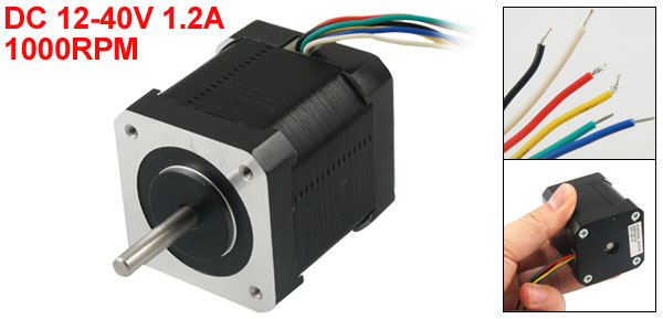 Product Name Stepping Motor Rated Voltage DC 12-40V Rated Current 1.2A Rated Speed 1000RPM Rated Torque 3.5Kg.cm Shaft Diameter 5mm/ 0.2" Motor Part Size (Approx.) 42 x 42 x 47mm/ 1.7" x 1.7" x 1.8" (L*W*H) Cable Length 300mm / 11.8" Material Metal, Plastic, Electronic Parts Color Black, Red, Blue, Green, White, Yellow, Silver Tone Weight 352g Package Content 1 x Stepping Motor