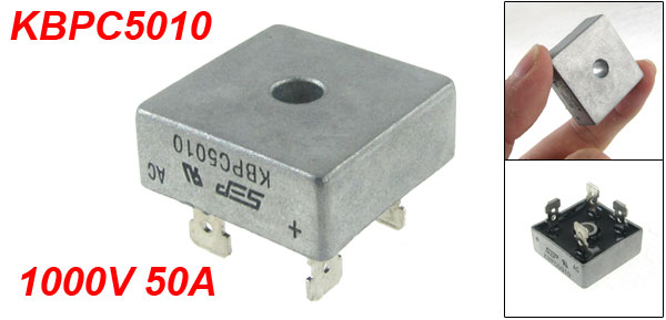 Product Name Bridge Rectifier Model KBPC5010 Max. Average Forward Rectified Current 50A Max. Recurrent Peak Reverse Voltage 1000V Max. RMS Bridge Input Voltage 700V Max. DC Blocking Voltage 1000V Operating Temperature Range -55-150°C Pitch Distance 18mm / 0.7" Terminal Size 6.2 x 16mm / 0.24" x 0.63" (W*L) Dimension 28 x 28 x 11mm / 1.1" x 1.1" x 0.43" (L*W*T) Mounted Hole Dia. 6mm / 0.24" Material Resin, Metal Color Black, Silver Tone Net Weight 26g Package Content 1 x Bridge Rectifier - Reviews
