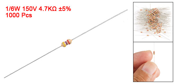 Details1000x 1/6W 4.7K Ohm 5% Through Hole Carbon Film Resistor  Product Name Carbon Film Resistors Rating Power 1/6W Resistance 4.7K Ohm Resistance Tolerance ± 5% Withstand Voltage 150V Size(Not Include Leads) 0.35 x 0.17cm / 0.138" x 0.067"(L*D) Leads Dia(Approx) 0.03cm / 0.012" Overall Length(Approx) 4.55cm / 1.8" Color See the Picture Weight 57g Package Content 1000(±2%) Pcs of Carbon Film Resistors