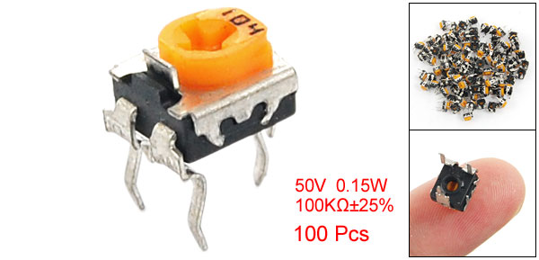 Pin Size (Each) 8 x 1mm / 5/16" x 5/128" (L * W ) Pin Pitch 5 x 6 x 6mm / 1/5" x 15/64" x 15/64" Color As Picture Shown Weight 35g Package Content 100 (±2%) x Variable Resistor Trimmer Potentiometer - Reviews