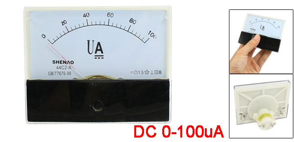Product Name Analog Ammeter Model No. 44C2-A Measuring Current Range DC 0-100uA Accuracy Class 1.5 Meter Front Size(Approx.) 100 x 80 x 12mm / 3.9" x 3.1" x 0.47"(L*W*T) Thread Dia Big: 3.5mm / 0.13"