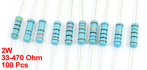 Product Name Metal Film Resistors Power Rating 2W Resistance 33-470 Ohm Tolerance ±1% Total Length(Approx.) 6.3cm /2.5" Body Size 5 x 15mm/0.20" x 0.59"(D*L) Color Blue Weight 85g Package Content 100(± 2%) x Metal Film Resistors - Reviews