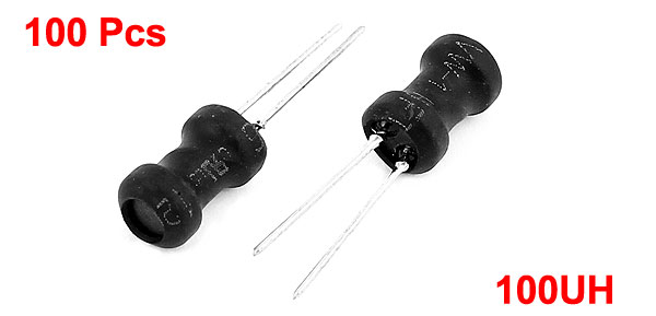 Product Name Inductor Inductance 100UH Body Size 6 x 10mm / 0.24" x 0.39"(D*H) Pin Length 15mm/ 0.59" Lead Distance 4mm / 0.16" Color Black, Silver Tone Weight 103g Package Content 100(±2%) x Inductors - Reviews