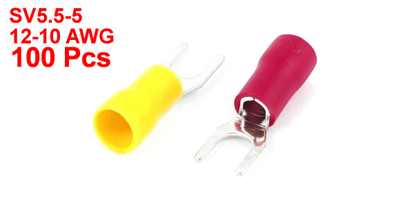 Product Name Fork Spade Terminal Model SV5.5-5 Suitable For 12-10 AWG Cable Used On #10Stud Max. Ampe 48A Color Red,Yellow, Silver Tone Weight 101g Package Content 100(+/-2%) x Fork Spade Terminal - Reviews