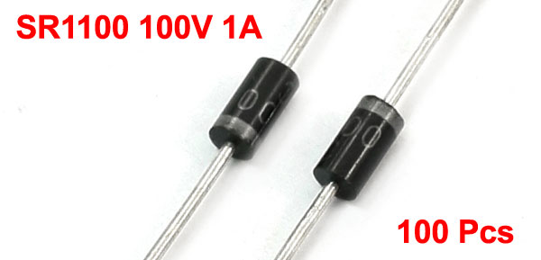 Product Name Schottky Rectifier Diode Model SR1100 Current 1A Reverse Voltage 100V Lead Size(Each Side) 0.7 x 2.5mm/0.08" x 0.1"(D*L) Body Size 2.5 x 5mm/0.1" x 0.2"(D*L) Color Black Weight 27g Package Content 100Pcs(±2%) x Schottky Diodes - Reviews
