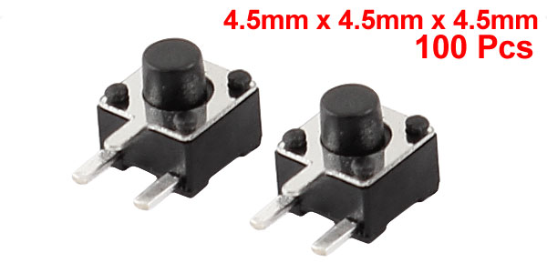 Product Name Tact Switch Type SPST Action Type Momentary Dimension 4.5 x 4.5 x 4.5mm / 0.18"x 0.18"x 0.18"(L*W*H) Button Dia 2mm / 0.08" Pin Length 1.5mm/0.06" Material Plastic, Metal, Electric Parts Color Black, Silver Tone Net Weight 14g Package Content 100(±2%) x Tact Switch - Reviews