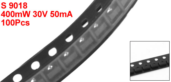 Product Name SMD Transistor Model S 9018 Capsulation / Package SOT-23 Pin Number 3 Pin Collector-Emitter Voltage Vceo 15V Collector-Base Voltage Vcbo 30V Emitter-Base Voltage Vbeo 5V Collector Current -Continuous Ic 50mA Collector Power Dissipation Pc 400mW Color Black Weight 3g Package Content 100 in 1 x SMD Transistor - Reviews
