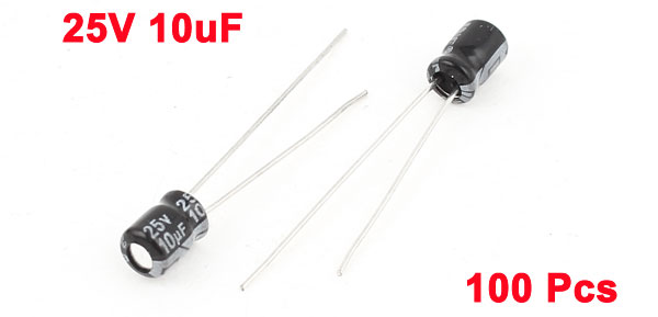 Product Name Aluminium Electrolytic Capacitor Type Radial Temperature Range -40~+105°C Voltage 25V Capacitance 10uF Body Size 4 x 6mm/0.16" x 0.24"(D*H) Lead Space 2mm/0.08" External Material Aluminum Total Net Weight 17g Main Color Black Package Content 100(±2%)PCS x Electrolytic Capacitors - Reviews