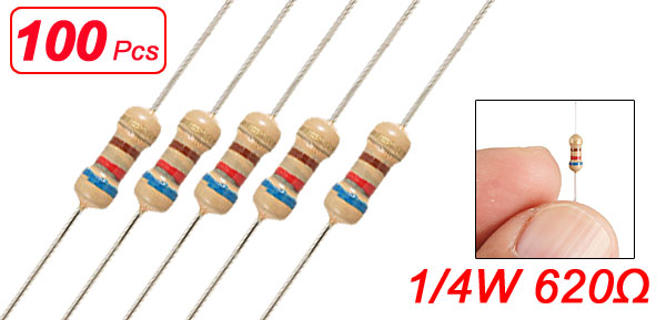 Details100pcs 620 Ohms OHM 1/4W 5% Axial Carbon Film Resistor  Product Name Resistor Resistor Type Carbon Film Rated Power 1/4 W Resistance Value 620Ω Tolerance ± 5% Withstang Voltage 250V Body Size (Approx.) 5 x 2mm/0.2'' x 0.08'' (L*D) Lead Size (Each End) 20 x 0.4mm / 0.8" x 0.016" (L*D) Total Length 45mm/1.8'' Color As Picture Shown Weight 10g Package Content 100(±2%) x Carbon Film Resistors