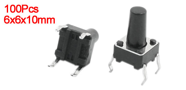 Details100Pcs 6x6x10mm Panel PCB Mount Momentary 4 Terminal Tact Switch  Product Name Tact Switch Contact Type Momentary Dimension 6 x 6 x 10mm / 0.24" x 0.24" x 0.4"(L*W*H) Button Diameter 3mm/ 0.12" Pin Pitch 7 x 4mm / 0.28" x 0.16" (L*W) Pin Length 4mm / 0.16" Material Plastic, Metal, Electric Parts Color Silver Tone, Black Total Weight 31g Package Content 100Pcs(±2%) x Tact Switch
