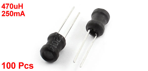 Product Name Radial Lead Inductor Inductance 470uH Rating Current 250mA Tolerance 10% Body Size 5 x 7mm / 0.2" x 0.27"(D*H) Pin Length 15mm/ 0.6" Lead Distance 2.5mm / 0.1" Color Black, Silver Tone Weight 65g Package Content 100(±2%) x Radial Lead Inductor - Reviews