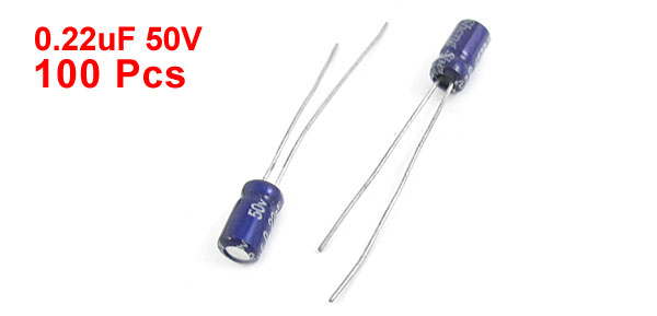 Product Name Electrolytic Capacitor Type Radial Maximum Temperature 105°C Voltage 50V Capacitance 0.22uF Tolerance ±10% Size 5 x 11mm/0.2" x 0.43"(D*H) Lead Spacing 2mm/0.08" Lead Length 20mm/0.8" 25mm/1" External Material Aluminum Total Net Weight 24g Main Color Blue Package Content 100(±2%)PCS x Electrolytic Capacitors - Reviews