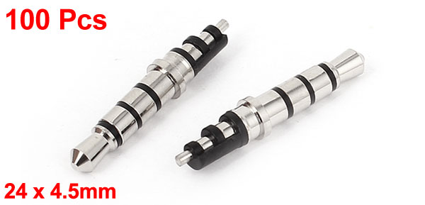 Main Color Silver Tone, Black Net Weight 85g Country of Manufacture CHINA Package Content 100pcs(+/-2%) x Stereo Male Plug Type 3.5mm Male Connector 4 Pole Material Metal, Plastic Total Size 24 x 4.5mm/ 0.94" x 0.18" (L*D) - Reviews