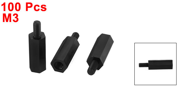 Product Name Hexagon Standoff Spacer Thread Size M3 Male Thread Length 6mm/0.24" Hex Part Length 15mm/0.6" Total Size 21 x 5.5mm/0.82" x 0.22"(L*D) Material Nylon Color Black Net Weight 43g Package Content 100(+/-2%) x Hexagon Standoff Spacers - Reviews