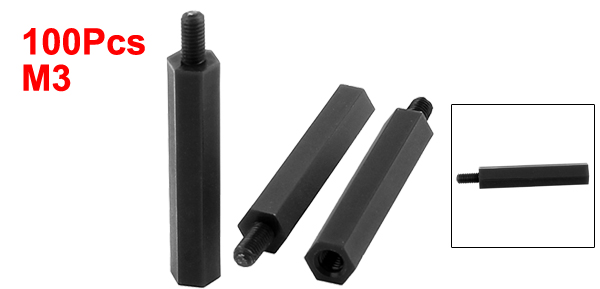 Product Name Hexagon Standoff Spacer Thread Size M3 Male Thread Length 6mm/0.24" Hex Part Length 30mm/1.2" Total Size 36 x 6mm/1.4" x 0.24"(L*D) Material Nylon Color Black Net Weight 84g Package Content 100(+/-2%) x Hexagon Standoff Spacers - Reviews
