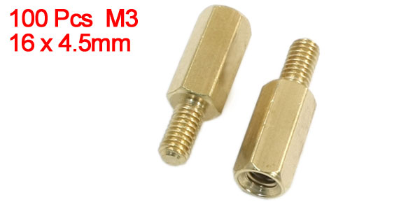 Product Name Standoff Hexagonal Spacer Thread Size M3 Male x M3 Female Male Thread Length 6mm/ 0.24" Body Length 10mm/ 0.39" Total Size(Approx.) 16 x 4.5mm/ 0.6" x 0.06" (L*Max.D) Material Brass Color Gold Tone Net Weight 142g Package Content 100(±2%) x Standoff Hexagonal Spacer