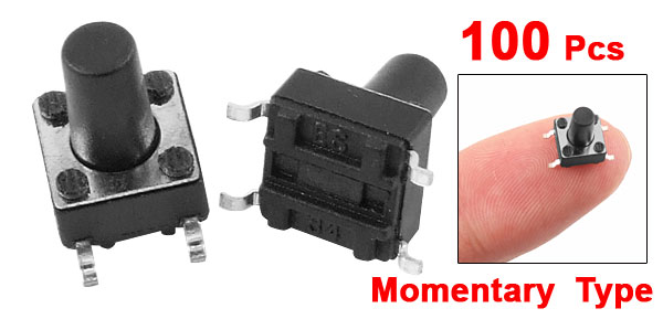 Product Name Tact Switch Action Type Momentary Quantity 100 Pcs ±2% Switch Size 6 x 6 x 9mm / 0.23" x 0.23" x 0.35" (W*L*H) Button Size 6 x 3mm/ 0.23" x 0.11"(H*D) Pin Spacing 9 x 4mm / 0.35" x 0.15"(L*W) Pin Size 2 x 1mm/ 0.07" x 0.03"(L*W) Material Plastic, Metal, Electric Parts Color Black, Silver Tone Net Weight 32g Package Content 100 Pcs ±2% x Tact Switches - Reviews