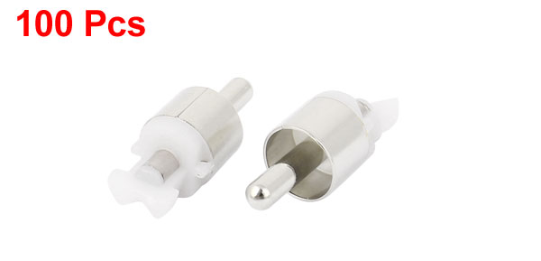 Main Color White, Silver Tone Net Weight 119g Total Size(Each) 24 x 9mm/ 0.94" x 0.35" (L*D) Country of Manufacture CHINA Package Content 100pcs(+/-2%) x RCA Connector Diameter(Approx) 8 x 3mm/ 0.3" x 0.12"(Hole*Pin) Type RCA Male Material Plastic, Metal - Reviews