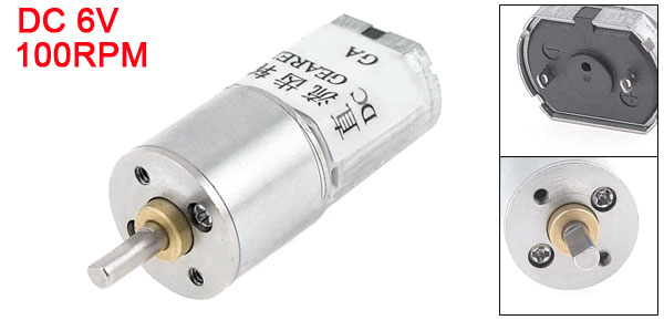 Product Name DC Geared Motor Rated Voltage DC 6V Output Speed 100RPM Shaft Diameter 3mm/ 0.24" Gearbox Part Size 16 x 15mm/ 0.6" x 0.6"(D*L) Motor Part Size 15 x 19mm/ 0.6" x 0.8"(D*L) Total Length(Approx) 42mm/ 1.6" Material Metal, Electronic Parts Color As Picture Shown Weight 23g Package Content 1 x DC Geared Motor - Reviews
