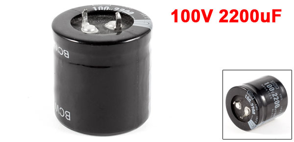 Product Name Electrolytic Capacitor Type Radial Lead Features Standard General Purpose Maximum Temperature 105°C Withstand Voltage 100V Capacitance 2200uF Body Size 30 x 30mm / 1.2" x 1.2'' (D*L) Terminal Spacing 9mm / 0.35'' Dielectric Material Aluminum Color Black Weight 42g Package Content 1 x Electrolytic Capacitors - Reviews