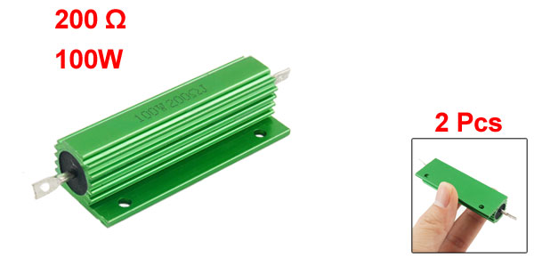 Details100W 200 Ohm Green Aluminum Housed Wirewound Resistors 2 Pcs  Product Name Aluminum Housed Resistor Resistance Value 200 Ω Power Rating 100W Resistance Tolerance ± 5% (J) Body Size 59 x 15mm/ 2.32" x 0.59" (L*D) Mounted Hole Size 1.8mm/ 0.07", 3mm/ 0.12" Total Size 81 x 21 x 15mm/ 3.2" x 0.83" x 0.59" (L*W*T) Casing Material Aluminum Color Green Weight 60g Package Content 2 x Aluminum Housed Resistor
