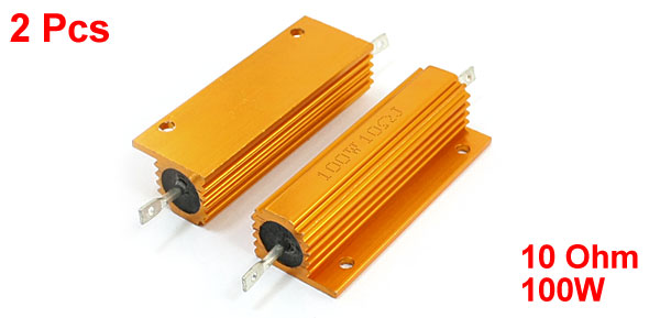 Details100Watt 10 Ohm Chassis Mounted Aluminum Shell Housded Clad Resistor 2 Pcs  Product Name Aluminum Wirewound Resistor Resistance Value 10 Ohm Power Rating 100W Mounting Hole Dia 3mm/ 0.12" Mount Hole to Hole Distance 41mm/ 1.6" Connect Hole Dia 2mm/0.08" Connect Hole to Hole Distance 77mm/ 3" Plate Size 60 x 21mm/ 2.4" x 0.83"(L*W) Body Size 60 x 15 x 15mm/ 2.4" x 0.59" x 0.59"(L*W*T) Total Length 85mm/ 3.3" External Material Aluminum Color Gold Tone Weight 60g Package Content 2 Pcs x Aluminum Wirewound Resistor