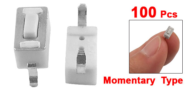 Product Name Tact Switch ActionType Momentary Quantity 100 Pcs ±2% Size 3 x 6 x 4.3mm / 0.11" x 0.23" x 0.16" (W*L*H) Button Size 3 x 1.5 x 1mm/ 0.11" x 0.05" x 0.03"(L*W*H) Pin Spacing 7mm / 0.275" Pin Size 4.5 x 1mm/ 0.17" x 0.03"(L*W) Material Plastic, Metal, Electric Parts Color White, Silver Tone Net Weight 18g Package Content 100 Pcs ±2% x Tact Switches - Reviews