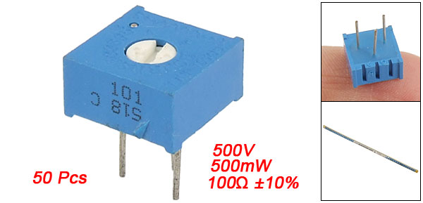 Product Name Cermet Potentiometer Model 3386P-1-101 Quantity 50±2% Pcs Withstand Voltage 500V Rated Power 500mW Resistance Value 100 Ohm Tolerance ±10% Mounting Type Through Hole(DIP) Resistive Material Cermet Body Size 9 x 9 x 5mm / 0.35" x 0.35" x 0.2" (L*W*H)