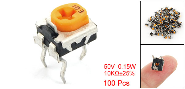 Pin Size (Each) 8 x 1mm / 5/16" x 5/128" (L * W ) Pin Pitch 5 x 6 x 6mm / 1/5" x 15/64" x 15/64" Color As Picture Shown Weight 32g Package Content 100 (±2%) x Variable Resistor Trimmer Potentiometer - Reviews