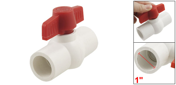Product Name Ball Valve Ends Type Slip x Slip Slip End Size 1" x 1" Handle Size 7.1 x 2.7cm/ 2.8" x 1.1"(L*Max.W) Overall Size (Approx.) 8.5 x 4.4 x 7.4cm/ 3.3" x 1.7" x 2.9"(L*Max.W*H) Color White, Red Material PVC Weight 96g Package 1 x Ball Valve - Reviews