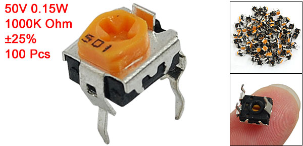 Product Name Variable Resistor Trimmer Potentiometer Max. Operating Voltage 50V Power Rating 0.15W Resistance Value 1000K Ohm Resistance Tolerance ±25% Mounting Type Through Hole (DIP) Resistive Material Carbon Film Square Body Size 6.8 x 6.8mm / 0.27" x 0.27" (L*W)