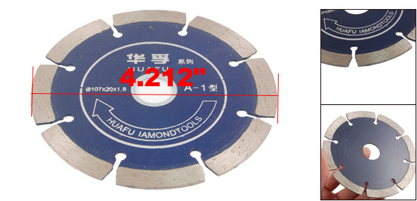 Product Name Diamond Saw Blade Material Metal, Diamond Particles Outside Diameter 107mm/ 4.212" Arbor Hole Diameter 20mm / 0.787" Diamond Rim Thickness 1.8mm/ 0.071" Net Weight 93g Package Content 1 x Diamond Saw Blade