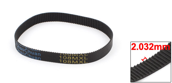 Product Name Timing Belt Model 108MXL Number of Teeth 135 Pitch 2.032mm / 0.08" Tooth Height 0.51mm / 0.02" Tooth Width 1.14mm / 0.04" Belt Width 10mm / 0.4" Belt Girth 274mm/ 0.9Ft/ 10.8" Total Height 1.14mm/0.04" Belt Material Neoprene (Synthetic Rubber) Core Wire Material Glass Fiber Color Black Net Weight 5g Package Content 1 x Timing Belt - Reviews