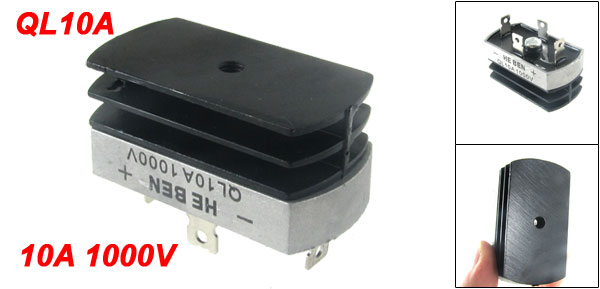 Product Name Single Phase Bridge Rectifier with Heatsink Model No. QL10A Output Current(DC) 10A Repetitive Peak Reverse Voltage(AC) 1000V Repetitive Peak Reverse Current 5mA Insulation Voltage 2500V Overall Size(Approx.) 61 x 32 x 39mm / 2.4" x 1.3" x 1.5"(L*W*H) Material Metal, Plastic Net Weight 79g Package Content 1 x Single Phase Bridge Rectifier with Heatsink - Reviews