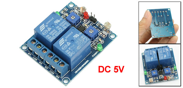 Product Name Photo Resistor Sensor + Relay Module Output Channel 2 Power Supply DC 5V Load Voltage 10A 250VAC/ 30VDC Size 50 x 42 x 17mm/ 2" x 1.7" x 0.67" (L*W*T) Hole Size 3mm/ 0.12" Material Electric Part Net Weight 31g Package Content 1 x Photo Resistor Sensor + Relay Module - Reviews