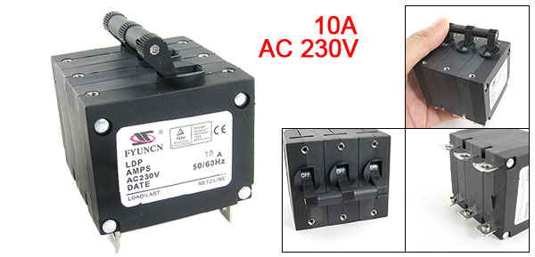 Product Name Miniature Circuit Breaker Model Number D230-3P Rated Current 10A Rated Voltage AC230V Frequency 50/60Hz Number of Poles 3 Number of Terminals 6 Overall Size (Approx.) 5.7 x 5.1 x 6.5cm/2.2" x 2.0" x 2.6"(L*W*H ) Material Plastic, Electric Components Color As Picture Shown Weight 151g Package Content 1 x Miniature Circuit Breaker - Reviews