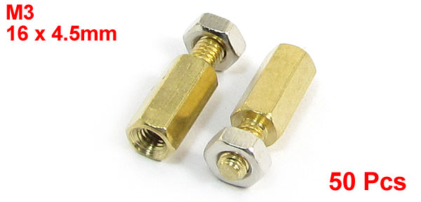 Product Name Standoff Hexagonal Spacer Thread Size M3 Male x M3 Female Male Thread Length 6mm/ 0.24" Body Length 10mm/ 0.39" Total Size(Approx.) 16 x 4.5mm/ 0.6" x 0.06" (L*Max.D) Material Brass Color Gold Tone Net Weight 86g Package Content 50 ( ±2%) x Standoff Hexagonal Spacer