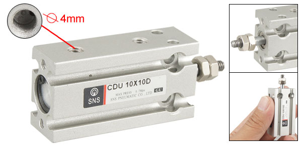 Product Name CDU Air Cylinder Model CDU 10X10D Bore 10mm Stroke 10mm Mounting Screw Dia. 3.5mm Inlet / Outlet Hole Dia 4mm Max Press 0.7Mpa Overall Size(Approx) 46 x 24 x 15mm / 1.8" x 0.95" x 0.6"(L*W*H) Material Stainless Steel Color Silver Tone Weight 36g Package Content 1 x Air Cylinder - Reviews