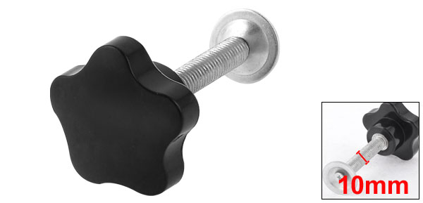 Details10mm Dia 50mm Length Male Thread Star Head Clamping Knob  Product Name Star Knob Type Screw On Head Diameter 50mm / 2" Thread Length 50mm/ 2" Thread Diameter 10mm / 0.4" Metal Plate Dia 25mm / 1" Total Height 81mm/ 3.2" Material Metal, Plastic Color Silver Tone, Black Weight 73g Package Content 1 x Star Knob